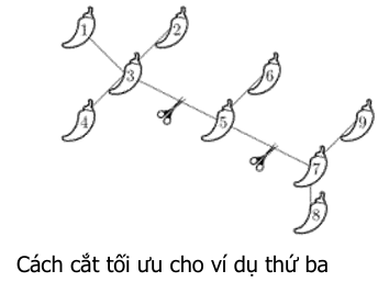 - Ở ví dụ thứ nhất có 3 cách cắt để tạo thành 1 đùm có 2 trái ớt và 2 đùm có 1 trái ớt. Do đó độ chêch lệch là 2 – 1 = 1.